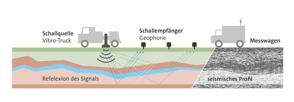 Wie funktioniert eine Seismik-Messung? Vibrationsfahrzeuge, sogenannte Vibrotrucks, fahren entlang von zuvor geplanten Routen. Über Rüttelplatten erzeugen sie leichte Vibrationen, die als Schallwellen in die Tiefe gelangen. Diese Wellen werden im Untergrund von verschiedenen Gesteinsschichten unterschiedlich reflektiert. Kleine Erdmikrofone, sogenannte Geophone, die zuvor entlang der Untersuchungsroute aufgestellt werden, zeichnen das Echo auf.